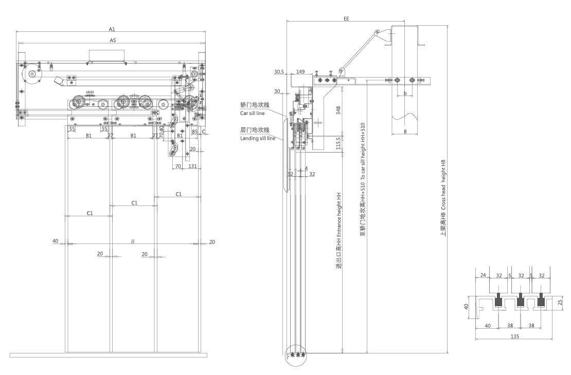 4、采用異步門刀;轎架、轎頂、轎壁安裝方式