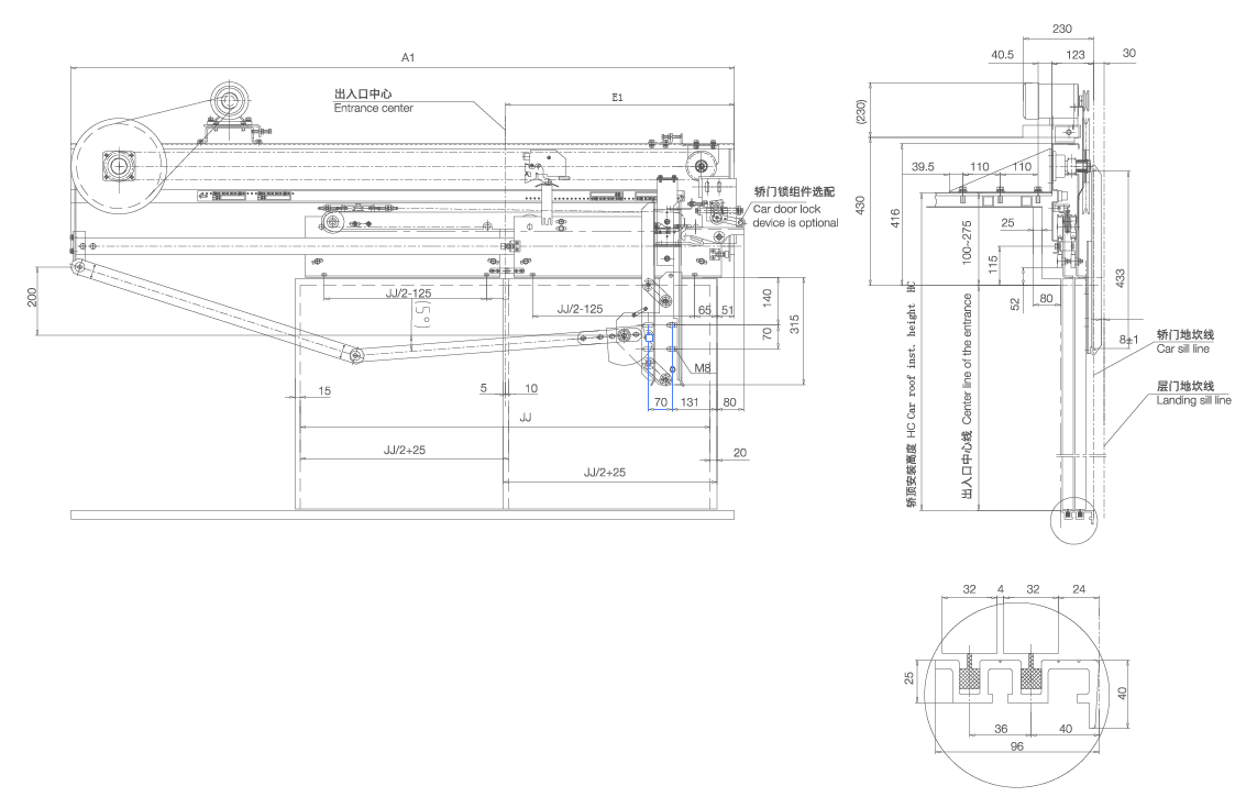 3、采用異步門刀,選配轎門鎖;轎架、轎頂安裝方式