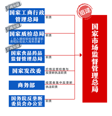 國家市場監督管理總局是此次機構改革中新組建的機構,為正部級國務院直屬機構。將國家工商行政管理總局的職責,國家質量監督檢驗檢疫總局的職責,國家食品藥品監督管理總局的職責,國家發展和改革委員會的價格監督檢查與反壟斷執法職責,商務部的經營者集中反壟斷執法以及國務院反壟斷委員會辦公室等職責整合,組建國家市場監督管理總局,作為國務院直屬機構。將國家質量監督檢驗檢疫總局的出入境檢驗檢疫管理職責和隊伍劃入海關總署。保留國務院食品安全委員會、國務院反壟斷委員會,具體工作由國家市場監督管理總局承擔。 國家認證認可監督管理委員會、國家標準化管理委員會職責劃入國家市場監督管理總局,對外保留牌子。 不再保留國家工商行政管理總局、國家質量監督檢驗檢疫總局、國家食品藥品監督管理總局。主要職責是,負責市場綜合監督管理,統一登記市場主體并建立信息公示和共享機制,組織市場監管綜合執法工作,承擔反壟斷統一執法,規范和維護市場秩序,組織實施質量強國戰略,負責工業產品質量安全、食品安全、特種設備安全監管,統一管理計量標準、檢驗檢測、認證認可工作等。同時,管理國家藥品監督管理局國家知識產權局兩個國家局。