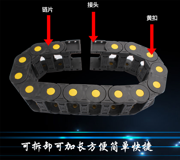 尼龍?zhí)箍随溎軌蚋玫乇WC拖鏈的使用壽命。選購穿線尼龍?zhí)箍随湑r,需要選擇內(nèi)置的電纜、油管、氣管、水管等中最粗的一根作為參考高度,加上至少10%的高度空間作為拖鏈的內(nèi)置高度。如果電纜油管、氣管、水管等需要重疊時,按重疊后的實際高度作為參考高度。