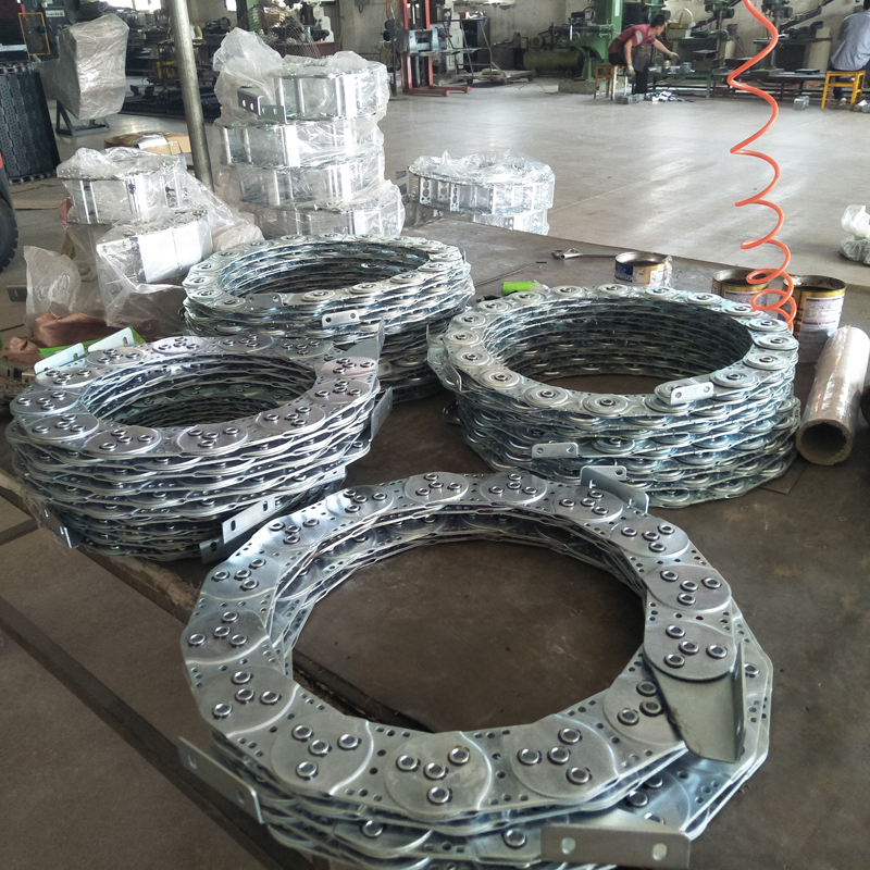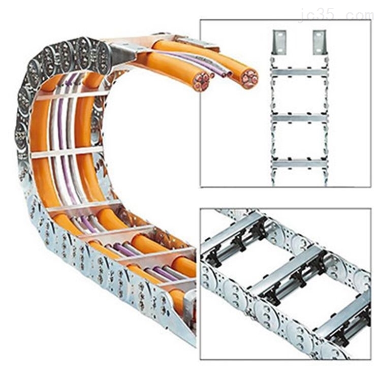 鋼制拖鏈的主體是由鏈扳(優(yōu)質(zhì)鋼板鍍鉻)、支撐扳(擠拉鋁合金)、軸銷(合金鋼)等部件組成,能使電纜或橡膠管與拖鏈之間不產(chǎn)生相對運動,不產(chǎn)生扭曲變形。鏈扳經(jīng)鍍鉻處理,外形效果新穎結(jié)構(gòu)合理,靈巧度高,鋼性好而不變形,安裝方便,使用可靠,易于拆裝,尤其是采用高強度耐磨材料合金銅為軸銷,提高了產(chǎn)品的耐磨強度,彎曲更靈活,阻力更小,降低了噪音,從而可保證長時間使用不變形,不下垂。