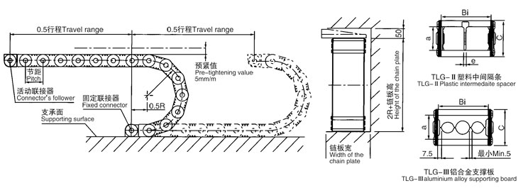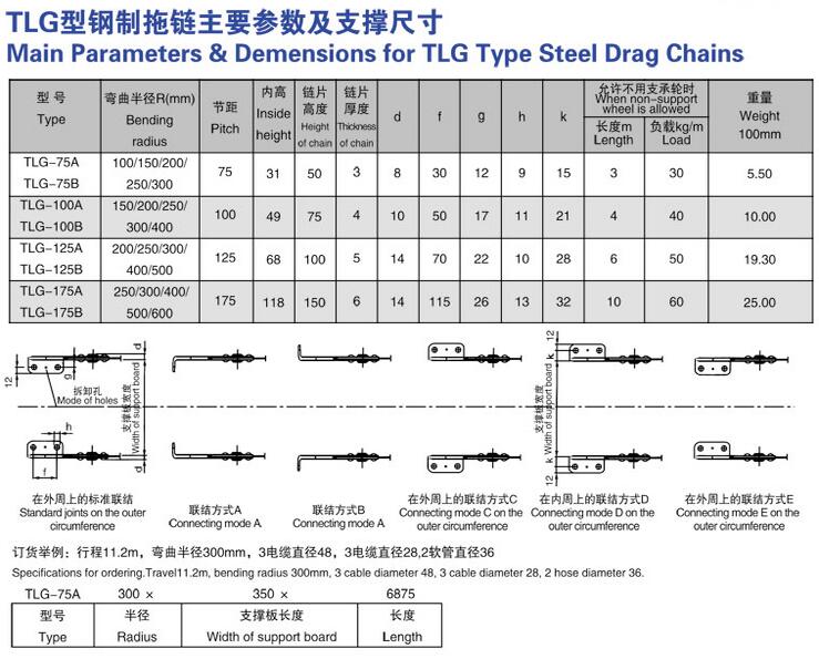 TLG型鋼鋁拖鏈可承載數(shù)量多,重量大的電纜及油管,自由懸置(允許不用支承輪)長(zhǎng)度大,支撐板可依顧客需要制作,適用于工作母機(jī),移動(dòng)機(jī)械等。其彎曲半徑為50-600mm,鏈板高度為35-150mm,可任意選用。